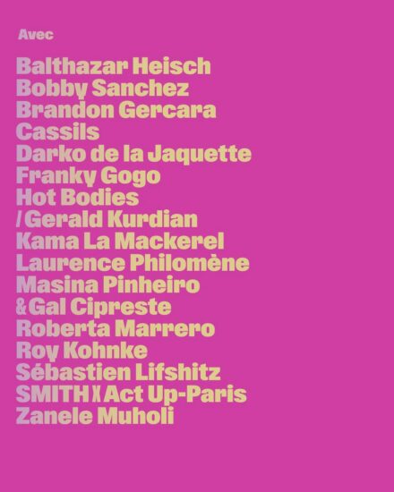Avec Balthazar Heisch, Bobby Sanchez, Brandon Gercara, Cassils, Darko de la Jaquette, Franky Gogo, Hot Bodies aka Gérald Kurdian, Kama La Mackerel, Masina Pinheiro & Gal Cipreste, Laurence Philomène, Roberta Marrero, Roy Köhnke, SMITH x Act Up-Paris, Zanele Muholi et la collection de Sébastien Lifshitz.