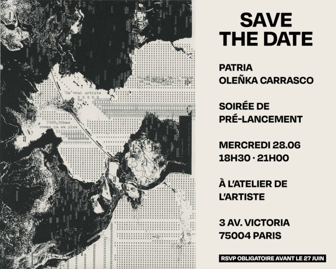 À l’Occasion de la sortie du livre « PATRIA » d’Oleñka Carrasco, nous avons le plaisir de vous inviter à une soirée de pré-lancement, à l’atelier de l’artiste.