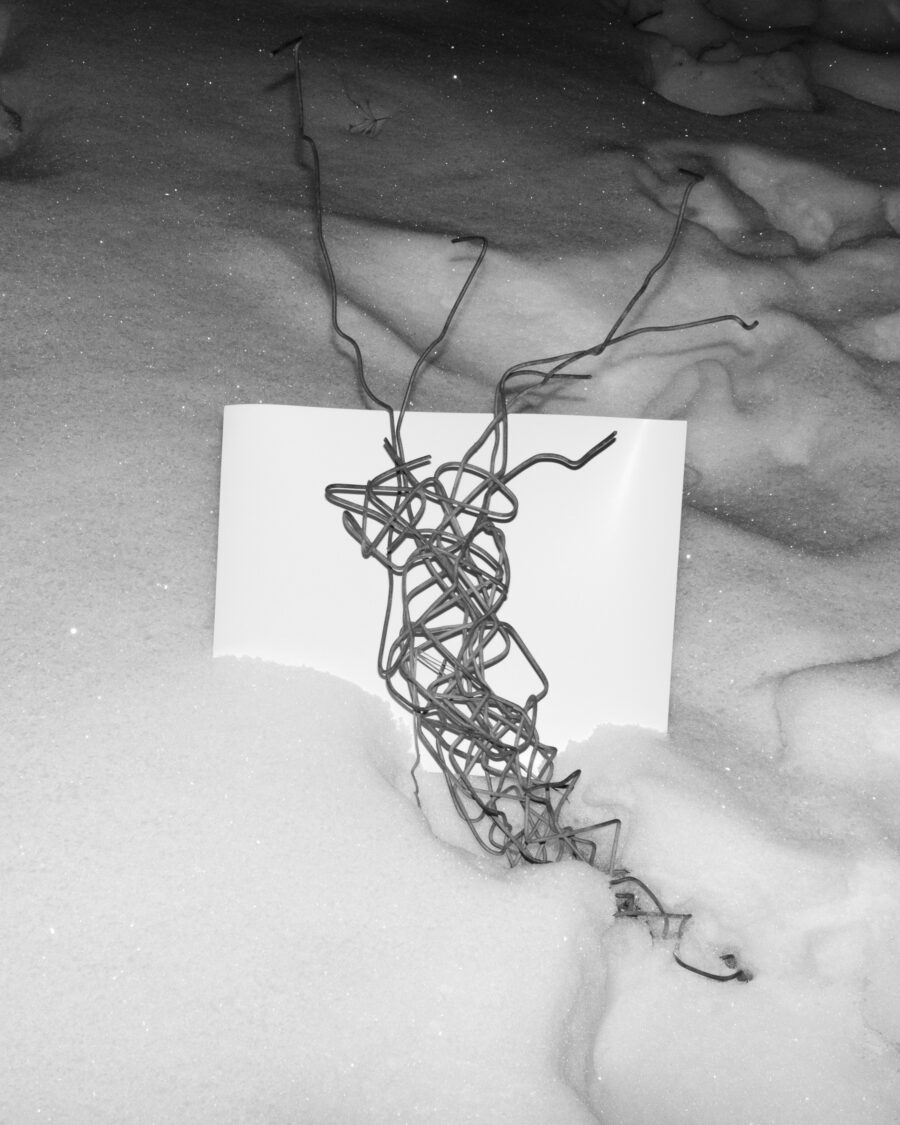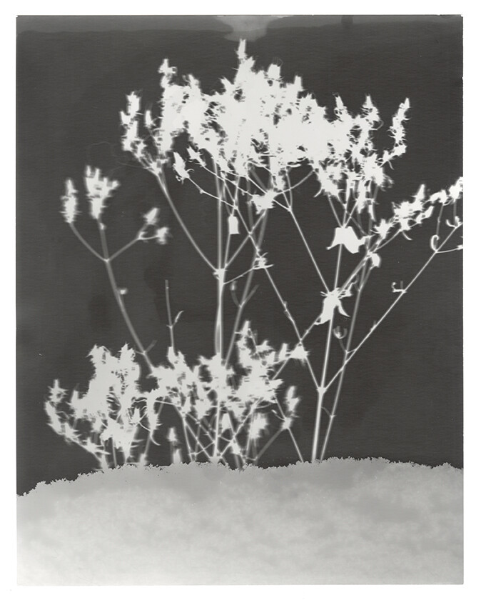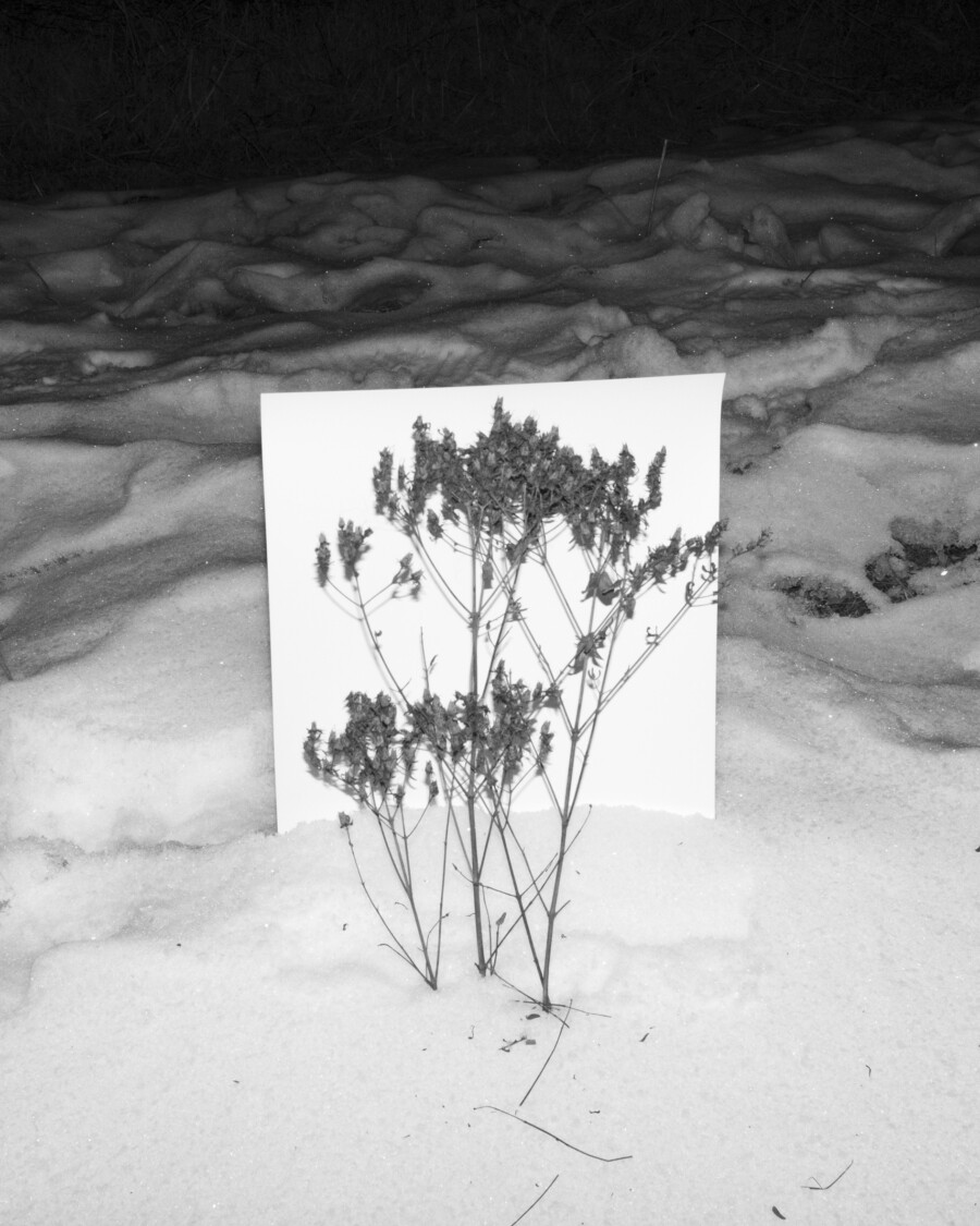 The photographic paper is then developed on site, in a makeshift nighttime laboratory. The photogram thus becomes an “imprint of the landscape” produced and developed entirely in situ.