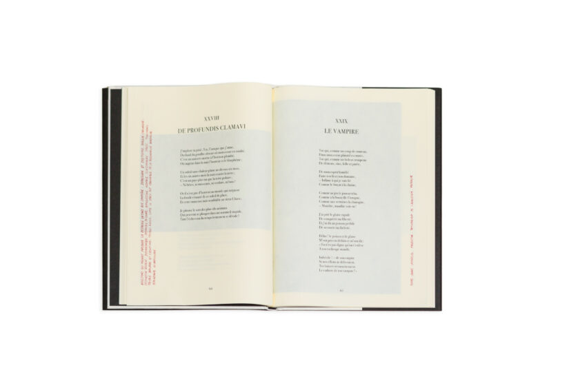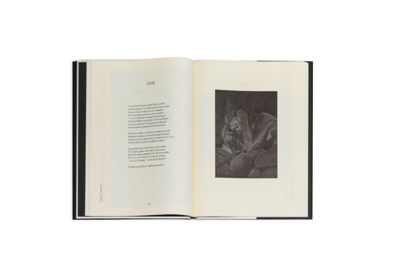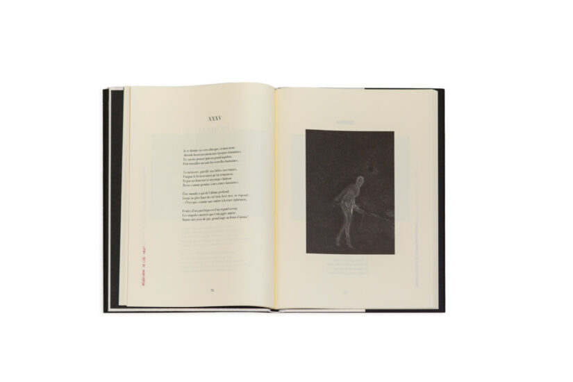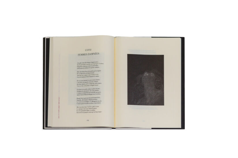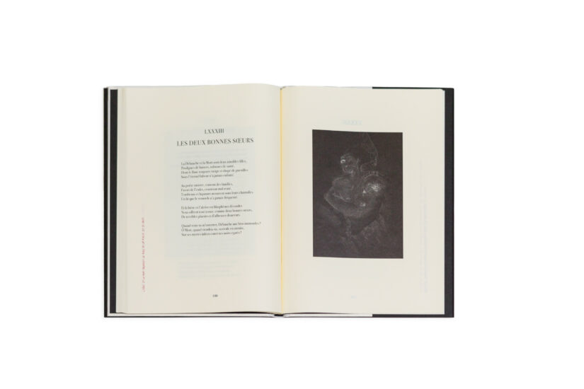Affixed vertically to the poems, these handwritten interventions assert themselves while leaving the original text its own space. A second sense of reading is thus offered to the reader between Baudelaire’s text and the interpretation given by d’Agata through the words as much as through the engravings.