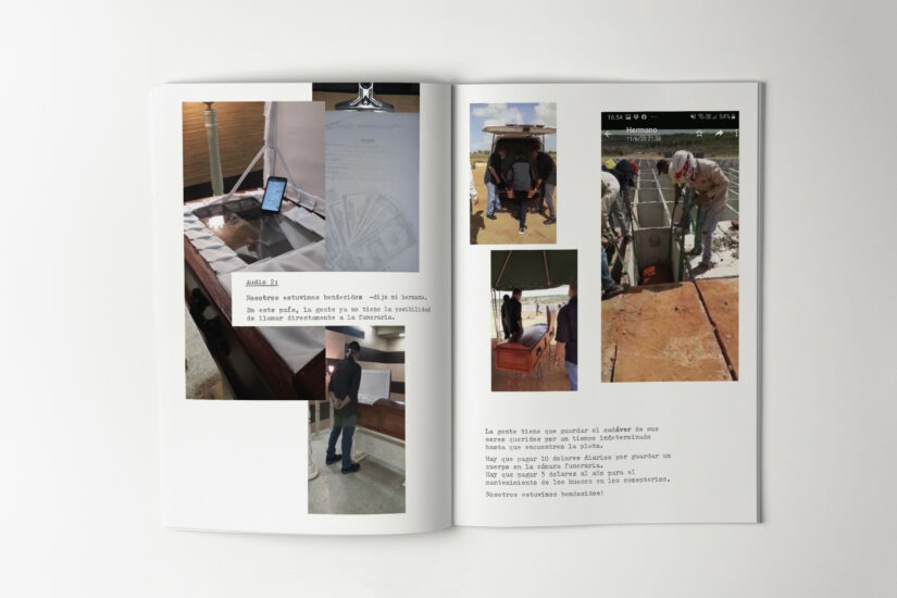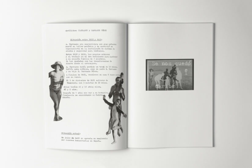 Expérience humaine par excellence, la confrontation avec la mort est ici racontée à travers la ré-appropriation artistique des archives familiales ; photographies, vidéos, audios… des milliers de documents envoyés par WhatsApp sur lesquels l’artiste intervient et crée des œuvres en soi. Par ailleurs, Oleñka Carrasco réalise des prises de vue de son lieu de vie en France, la « maison prêtée », clichés qu’elle transforme, manipule, altère par l’utilisation d’une machine à écrire. Le texte dactylographié dialogue avec les images et semble, à mesure que l’histoire se raconte, révéler le mystère de ces vies humaines tout en l’intensifiant.
