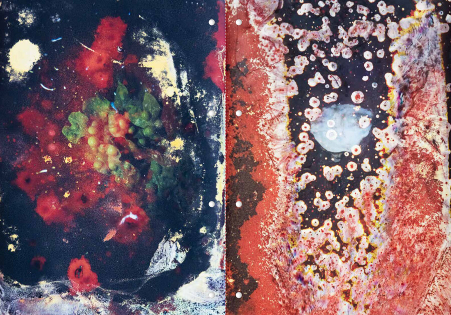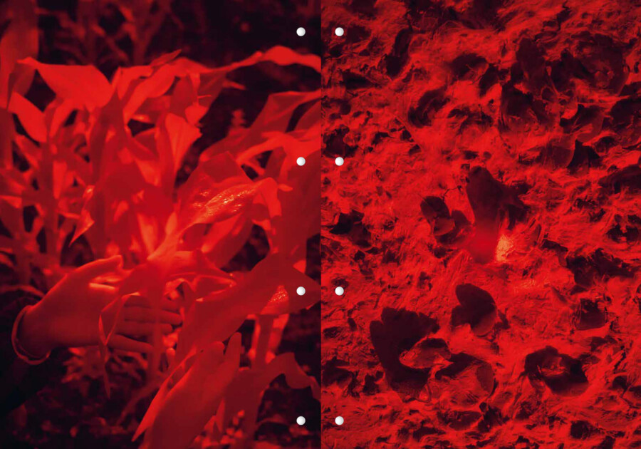 Ainsi, elle propose dans cette série de matérialiser le rayonnement rouge du soleil qui contribue au développement des algues toxiques. Chaque oeuvre témoigne d’un écosystème menacé par la putrefaction des végétaux. Le procédé de creation prend plusieurs semaines : des cultures poussent sur les tirages et c’est la toxicité elle-même qui s’incarne sur la photographie et devient le substrat des algues.